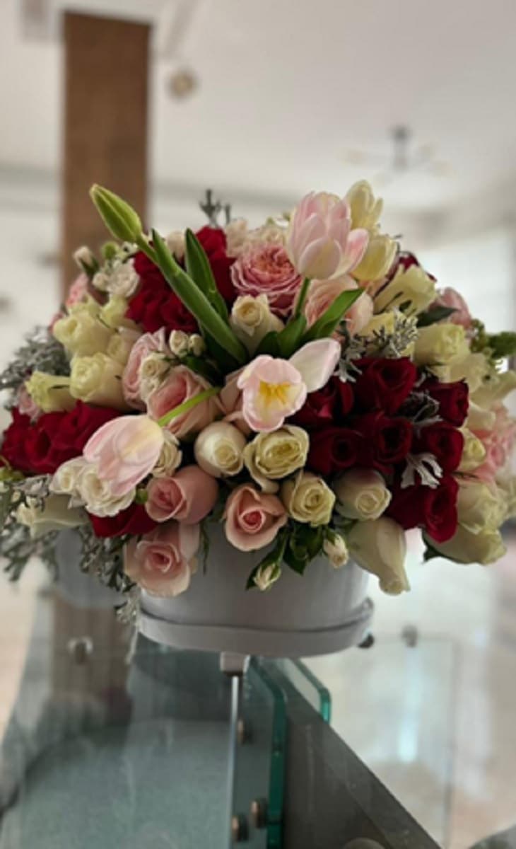 Rosas en diferentes tonalidades, rosas inglesas, tulipanes, ornithogalum y mini rosas blancas.